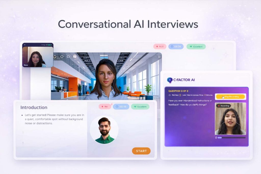 Within our C-Factor.AI platform, tools like Aly, Noor, and Riya bring this experience to life. Each of these AI interview modules adapts dynamically to a candidate’s responses and asking follow-up questions, gauging communication style, and assessing confidence in real time.