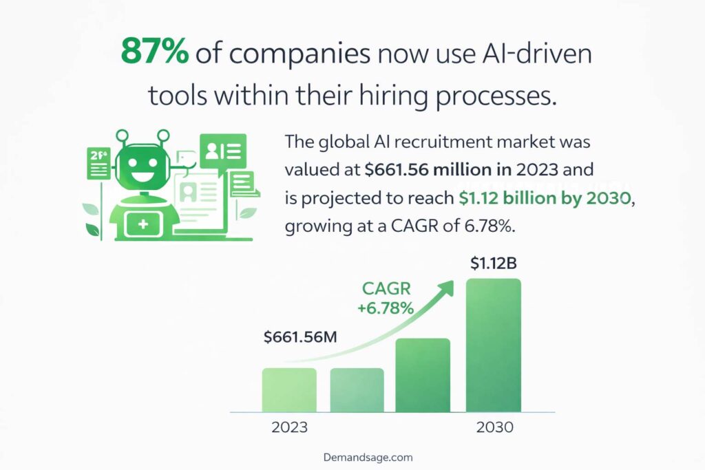 As per the latest data, 87% of companies now use AI-driven tools within their hiring processes. The global AI recruitment market was valued at $661.56 million in 2023 and is projected to reach $1.12 billion by 2030, growing at a CAGR of 6.78%.