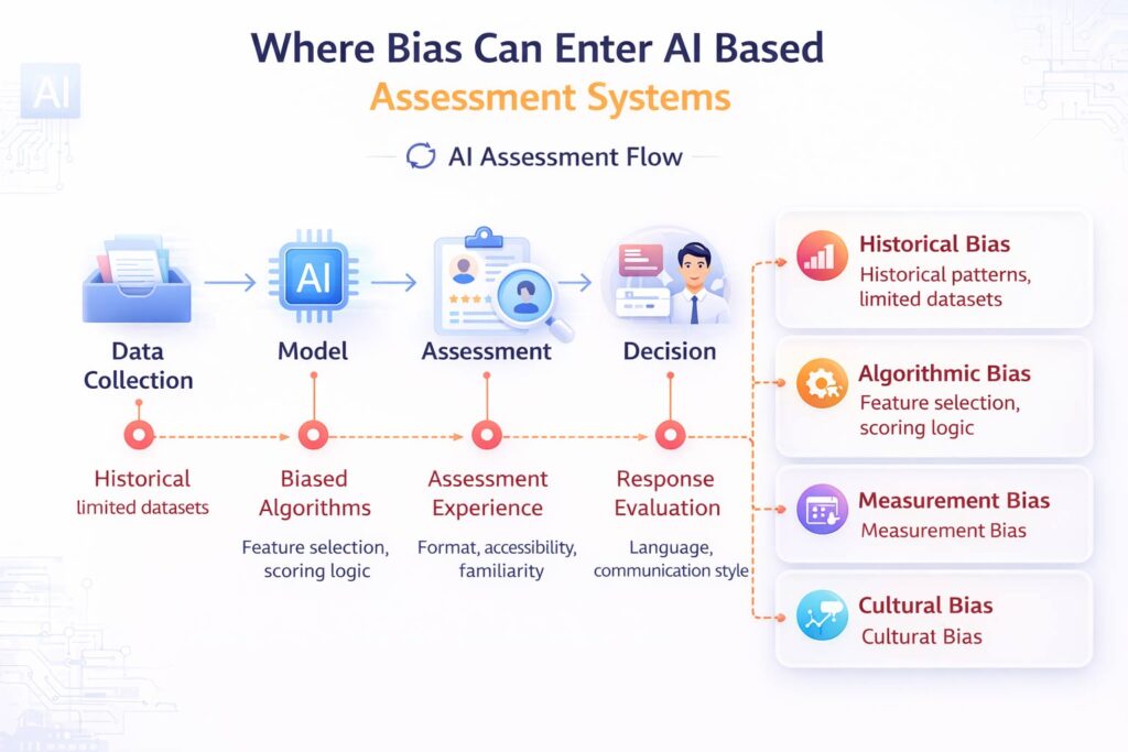 Yet efficiency alone does not guarantee fairness. The real challenge lies in understanding how bias can quietly shape outcomes within these systems. Recognizing the types of bias in AI based assessment is essential for building responsible hiring strategies.