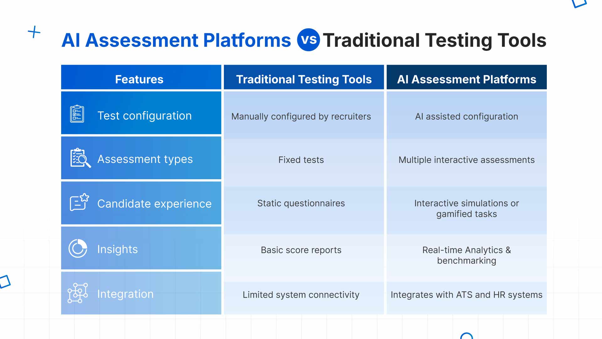 Recruiters should evaluate AI assessment platforms based on hiring volume, assessment objectives, and candidate experience goals. Some platforms focus heavily on technical skill evaluation while others emphasize behavioral measurement or interview automation.